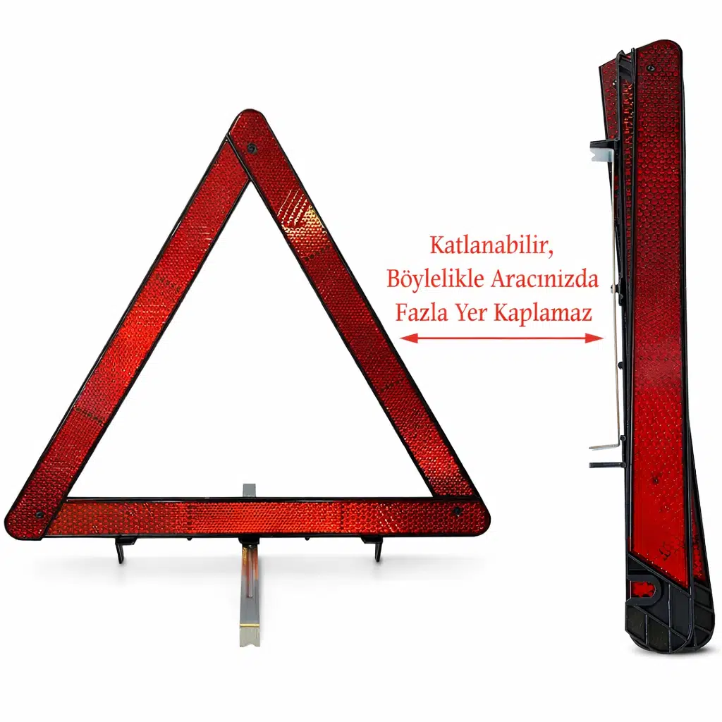 Yüksek reflektif yüzeyi sayesinde gece ve gündüz fark edilmenizi kolaylaştırır. Sağlam metal ayak yapısı zeminde dengeli duruş sağlar ve rüzgarlı hava koşullarında bile stabil kullanım sunar. Katlanabilir tasarımı sayesinde kullanılmadığında kolayca katlanır ve araç bagajında fazla yer kaplamaz.