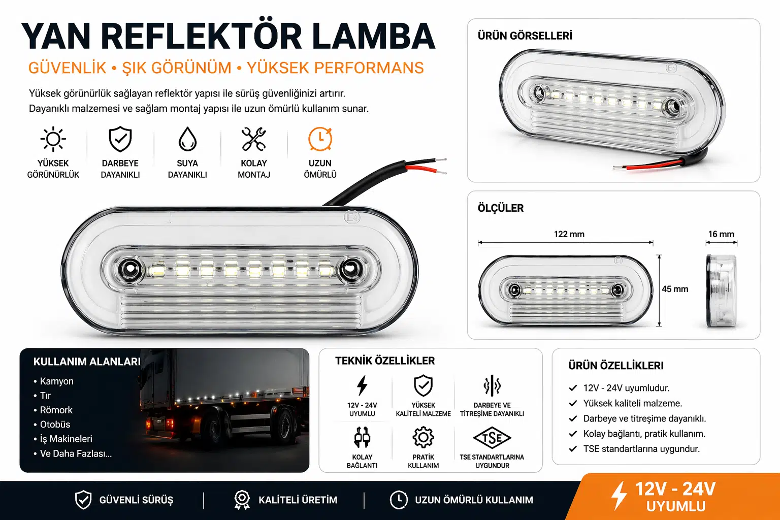 Mega Oto Market 12-24V Beyaz Yere Bakan LED Yan Reflektör Lamba, ağır vasıta ve ticari araçlar için özel olarak tasarlanmış yüksek performanslı bir aydınlatma çözümüdür. Kamyon, tır, römork, otobüs ve iş makinelerinde güvenli sürüşü destekleyen bu ürün, yere bakan ışık yapısı sayesinde gece ve düşük görüş koşullarında maksimum fark edilirlik sağlar.