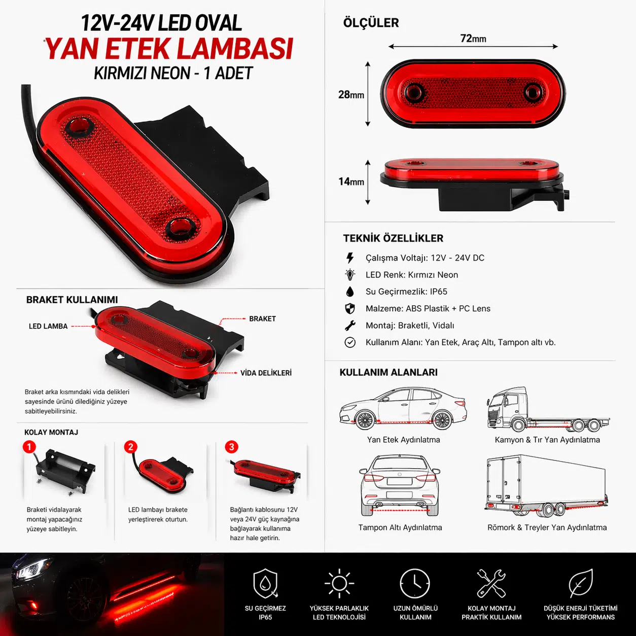 Braketli yapısı sayesinde kolay montaj imkanı sunan bu ürün, aracın altına veya yan etek bölgesine sağlam şekilde sabitlenir. Yüksek parlaklık sağlayan LED teknolojisi ile gece sürüşlerinde fark edilirliği artırırken, aracınıza sportif ve şık bir görünüm kazandırır.