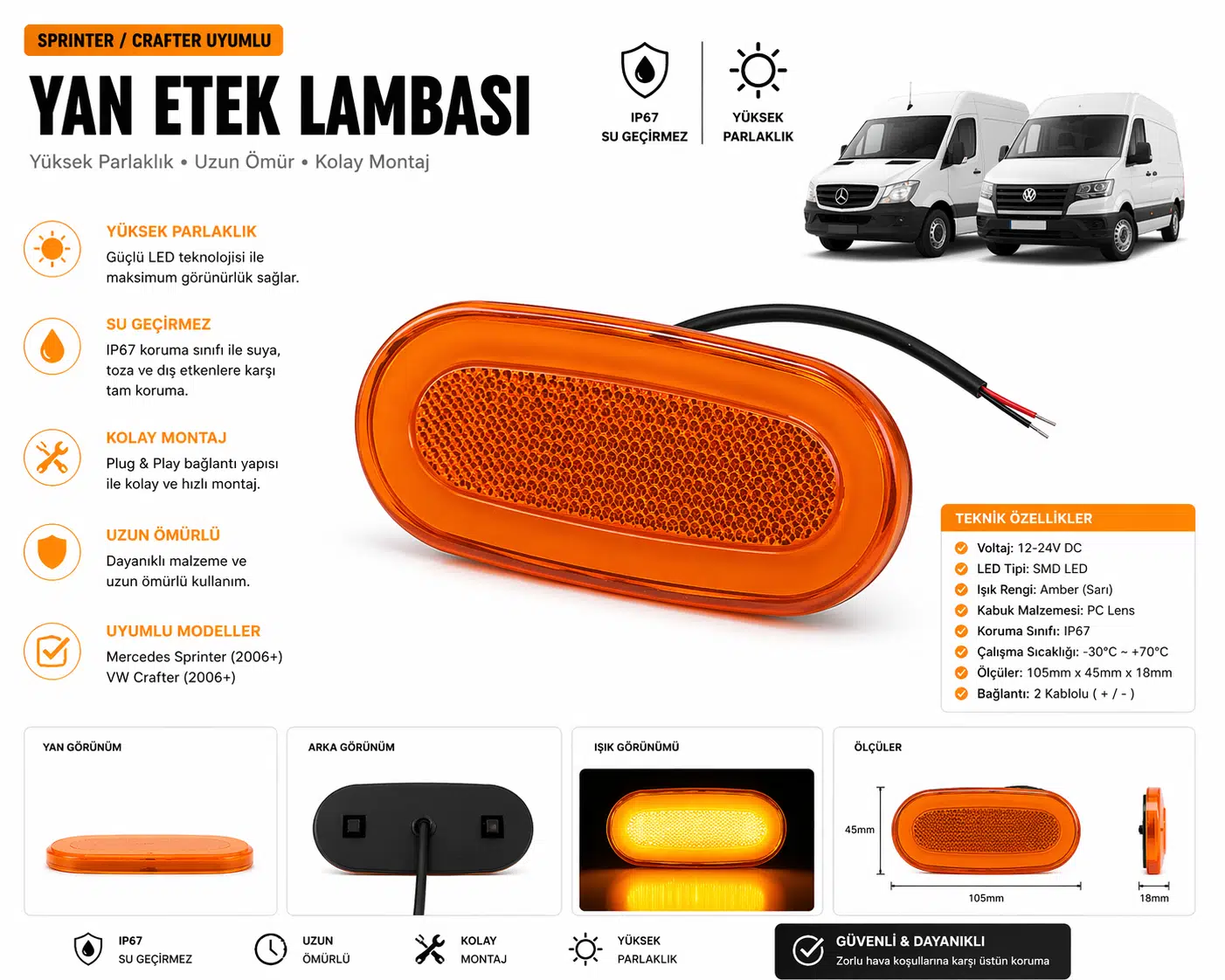 Mercedes Sprinter ve Volkswagen Crafter modelleriyle uyumlu olan bu ürün, araç yan etek ve alt aydınlatma uygulamaları için ideal çözümdür. Modern tasarımı ve homojen ışık dağılımı sayesinde aracınıza profesyonel ve şık bir görünüm kazandırır.