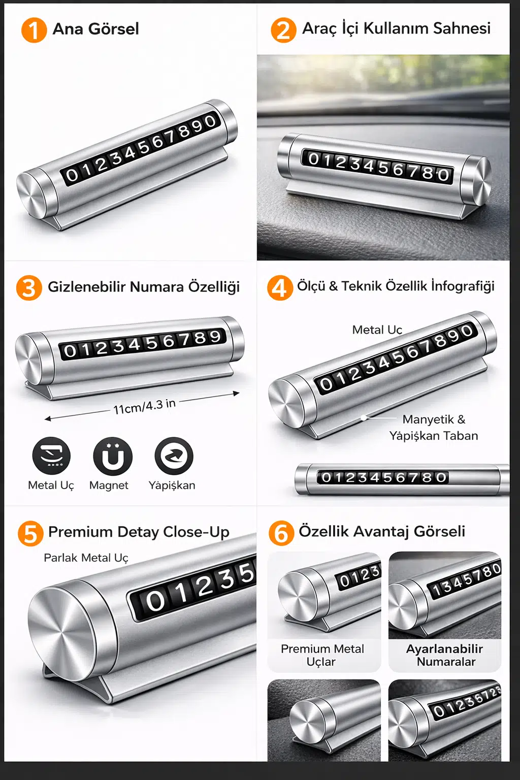 Numara Çevirmeli Oto Parkmatik Park Numarası, aracınızı park ettiğiniz alanlarda iletişim bilgilerinizi düzenli, şık ve güvenli şekilde sergilemeniz için tasarlanmış dayanıklı bir oto aksesuar ürünüdür. Premium alüminyum metal kasa yapısı sayesinde hem uzun ömürlü kullanım sunar hem de araç içi estetiğe modern bir görünüm kazandırır.