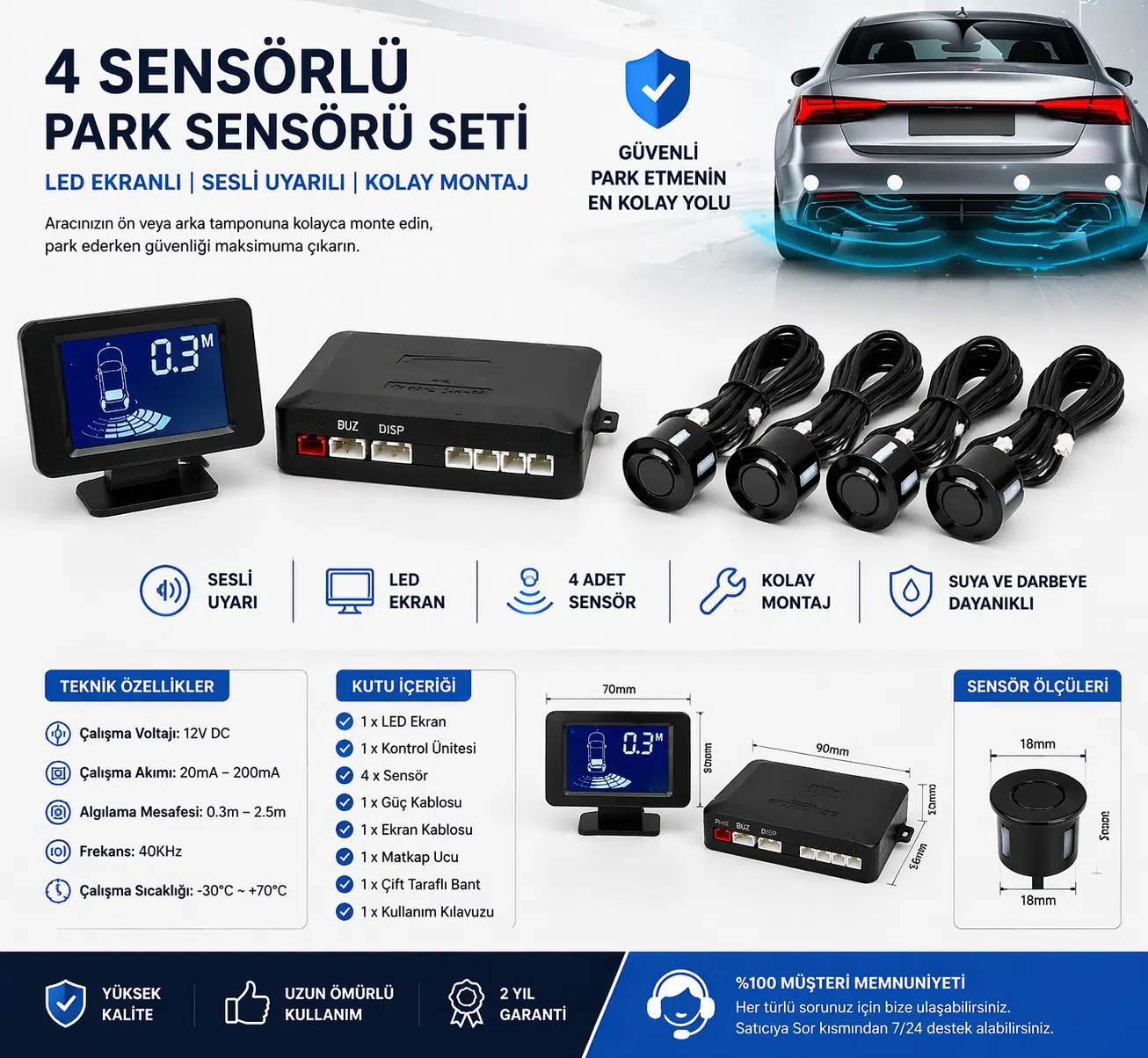 Dijital LED ekranı sayesinde mesafe bilgisi anlık ve net şekilde görüntülenir. Sesli uyarı sistemi ile yaklaşan engeller hakkında sürücüyü kademeli olarak bilgilendirir. Böylece hem görsel hem işitsel destek ile park işlemi çok daha kolay hale gelir.