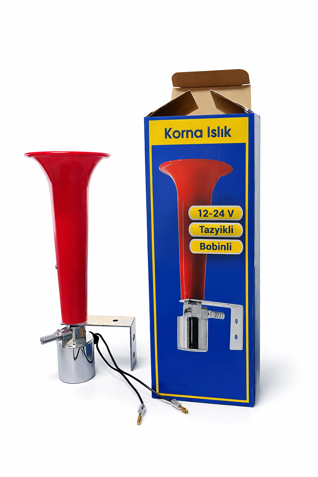 12V ve 24V uyumlu yapısı ile geniş araç yelpazesinde kullanılabilir. Tazyikli ve bobinli sistemi sayesinde güçlü, net ve keskin bir ses çıkışı sunar. Dayanıklı metal gövdesi uzun ömürlü kullanım sağlarken, kırmızı renk tasarımı ile estetik bir görünüm sunar.