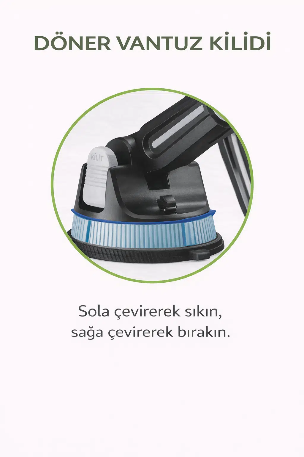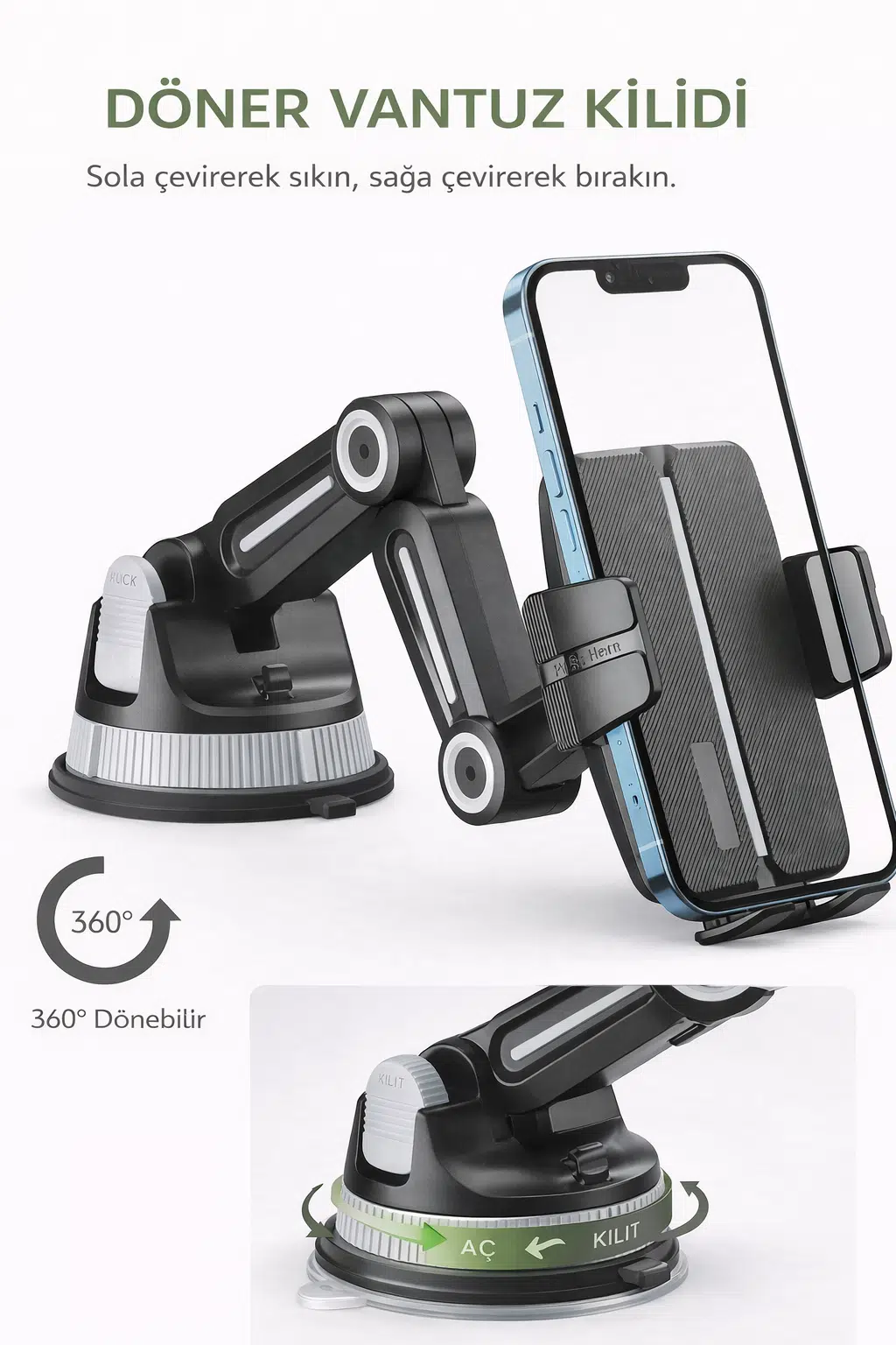 Güçlü vakumlu vantuz sistemi sayesinde ön cam, torpido ve düz yüzeylere sağlam şekilde tutunur. Özel kilit mekanizması titreşim ve sarsıntıyı minimuma indirerek telefonun sabit kalmasına yardımcı olur. İz bırakmadan sökülüp tekrar kullanılabilen yapısı sayesinde farklı araçlarda da rahatlıkla kullanılabilir.