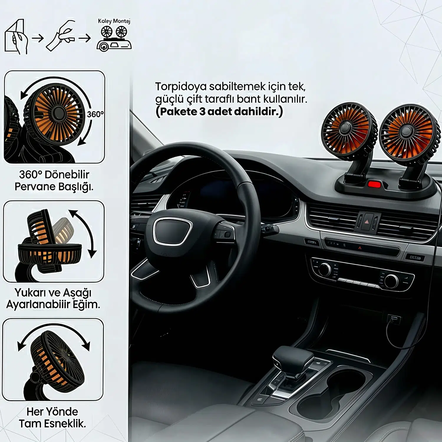 Mega Oto Market Araç İçi Torpido Üstü 360° Döner Başlıklı Çift Fanlı USB Oto Vantilatör, yaz aylarında araç içinde ferah bir sürüş deneyimi sunmak için geliştirilmiş pratik ve etkili bir çözümdür. Çift fanlı yapısı sayesinde hava akışını geniş bir alana yayarak hem sürücü hem de yolcular için dengeli serinlik sağlar.