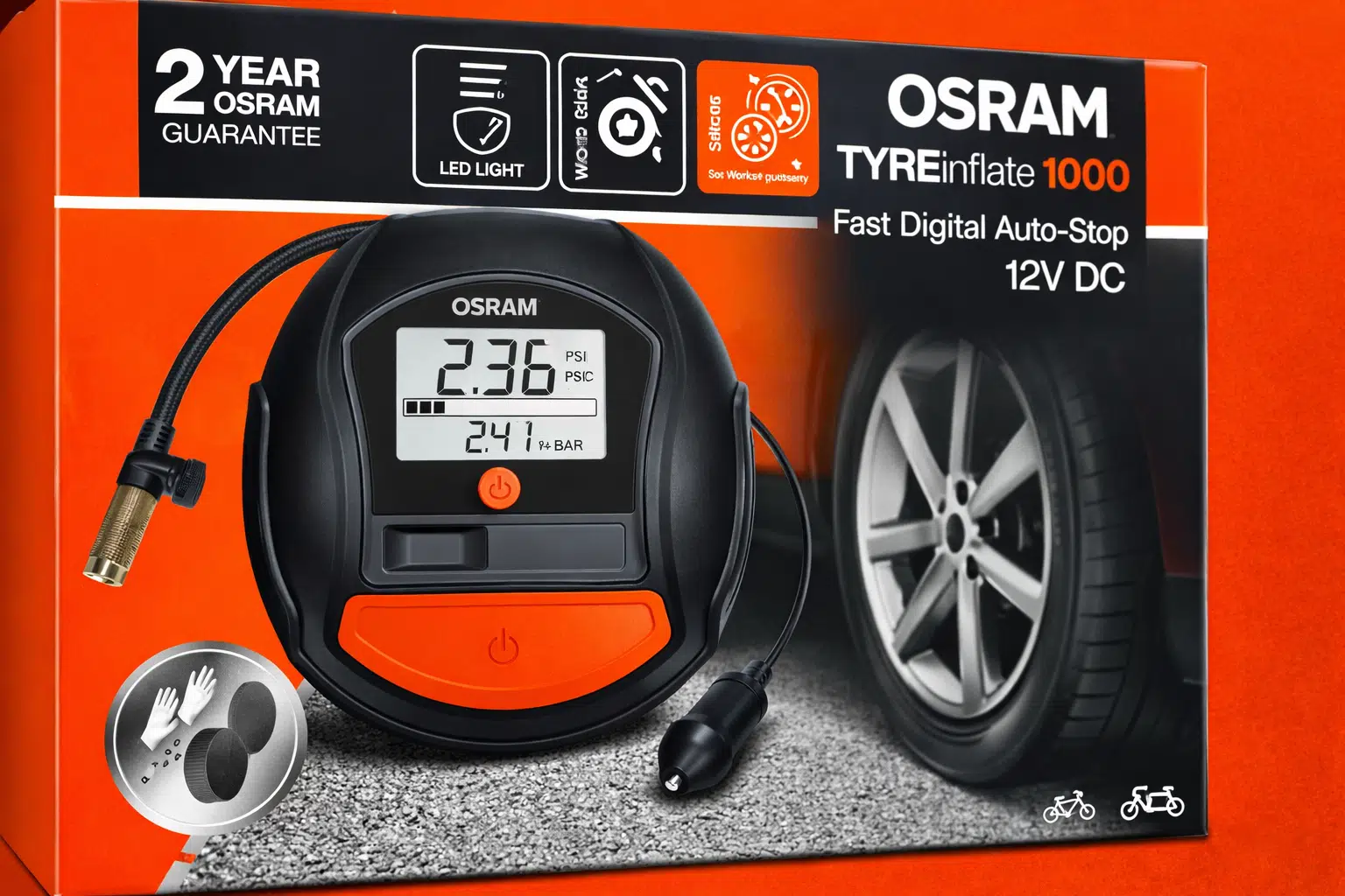 TYREinflate 1000, 12V araç çakmak soketi üzerinden çalışır ve uzun bağlantı kablosu sayesinde tüm lastiklere kolayca ulaşır. Sağlam hortum yapısı ve kaliteli sibop başlığı hava kaçağını önler, pratik ve hızlı bağlantı sağlar.