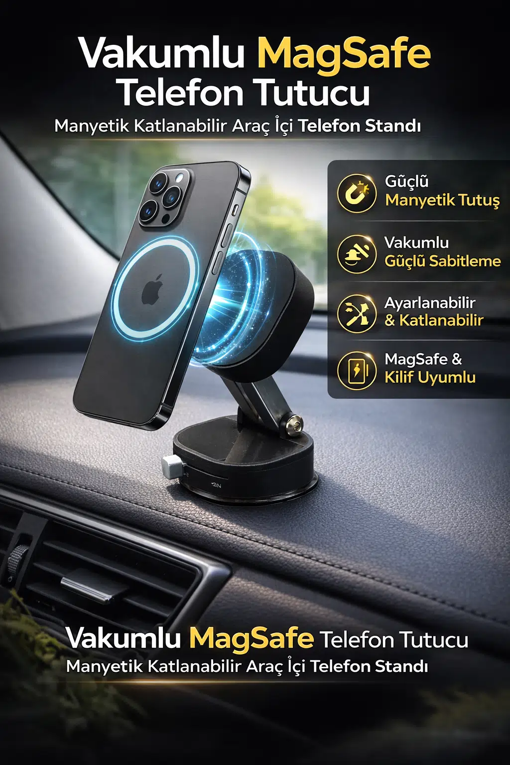 Vakumlu MagSafe Telefon Tutucu – Manyetik Katlanabilir Araç İçi Telefon Standı, sürüş sırasında telefonunuzu güvenli, sabit ve ideal görüş açısında kullanabilmeniz için tasarlanmış güçlü ve pratik bir oto aksesuar ürünüdür. MagSafe uyumlu manyetik yapısı sayesinde cihazınızı tek hareketle sabitleyebilir, navigasyon ve görüşmelerinizi konforlu şekilde gerçekleştirebilirsiniz.