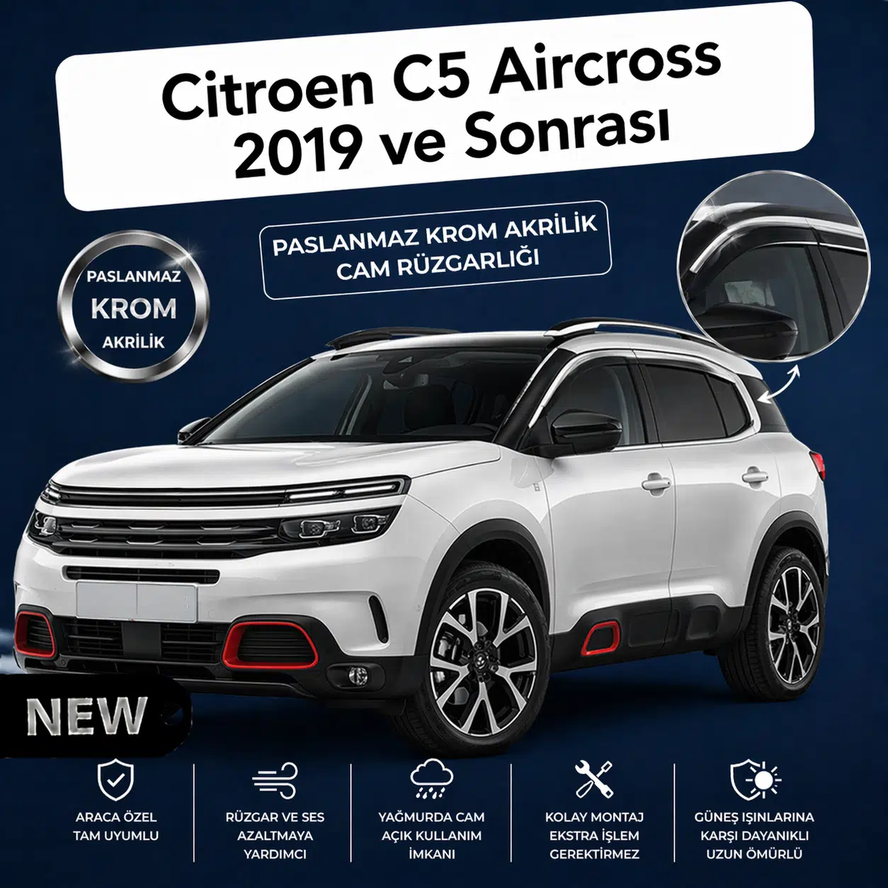 Citroen C5 Aircross 2019 ve üzeri modeller ile tam uyumlu olarak üretilen bu ürün, sürüş sırasında rüzgarın içeri girişini minimum seviyeye indirir. Bu sayede daha sessiz ve konforlu bir sürüş deneyimi sunarken, yağışlı havalarda camınızı aralayarak temiz hava almanıza da imkan tanır.