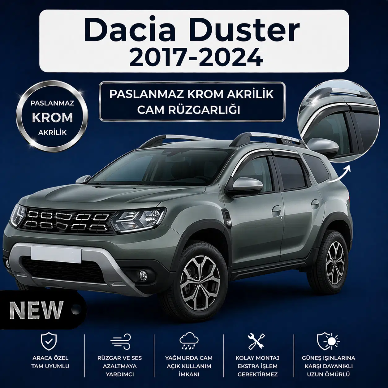Dacia Duster 2017, 2018, 2019, 2020, 2021, 2022, 2023 ve 2024 model araçlarla tam uyumlu olarak üretilmiştir. Rüzgarın araç içine girişini minimize ederek daha sessiz bir sürüş deneyimi sunar. Ayrıca yağışlı havalarda camınızı aralayarak temiz hava almanıza imkan tanır.