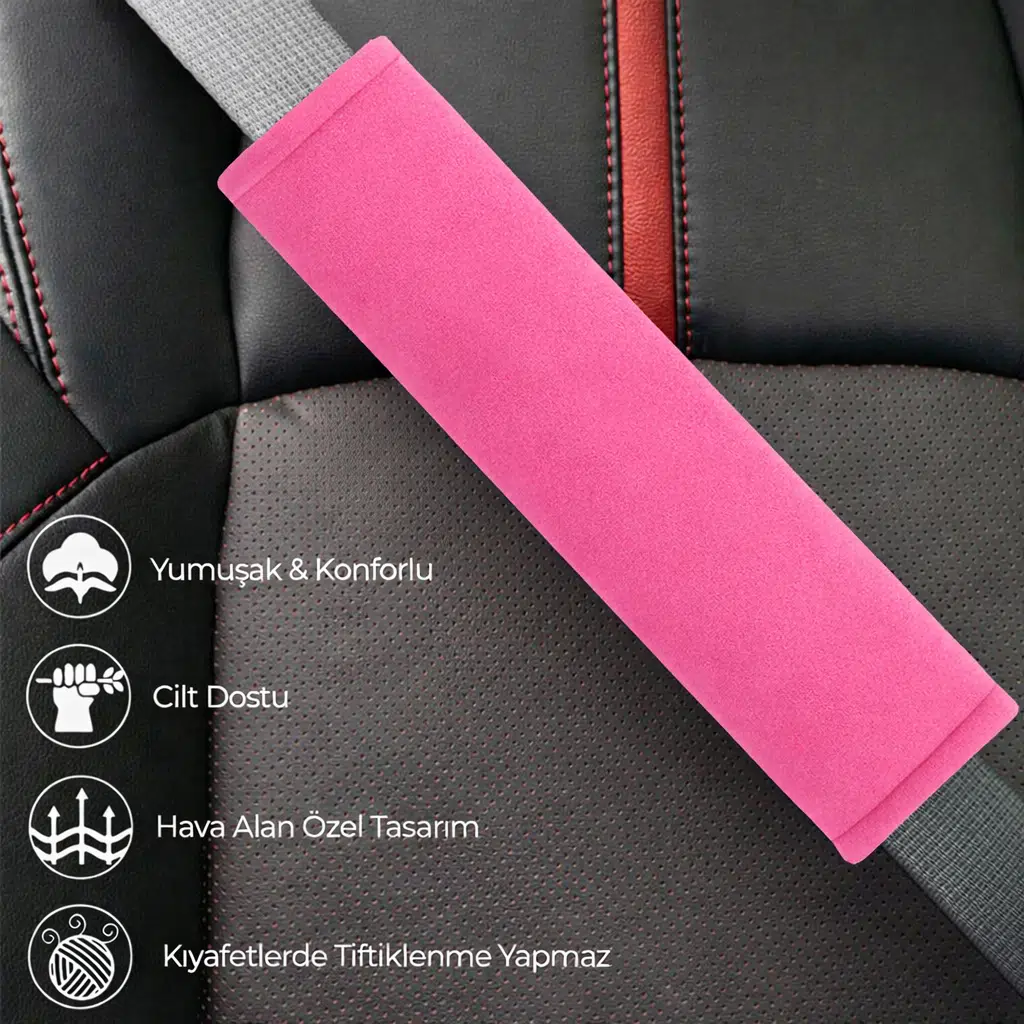 Pembe yumuşak kumaş emniyet kemer kılıfı, emniyet kemerinin boyun ve omuz bölgesinde oluşturduğu rahatsızlığı azaltmak için tasarlanmıştır. Yumuşak dokusu sayesinde sürüş ve yolculuk sırasında ekstra konfor sağlar.